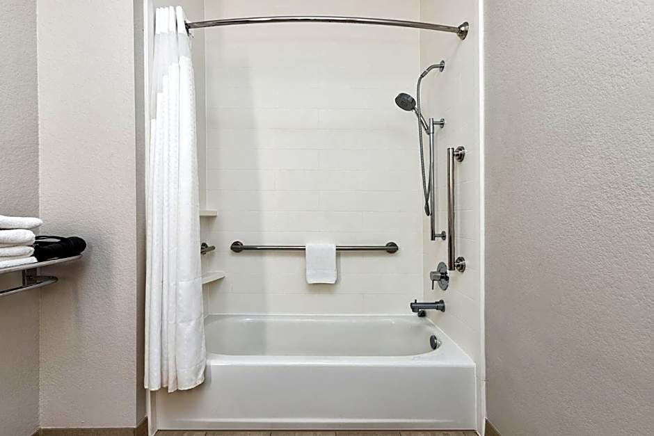 This wheel chair accessible room includes satellite TV, a microwave and a small refrigerator.